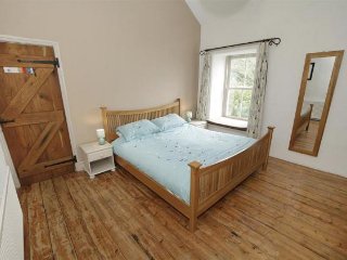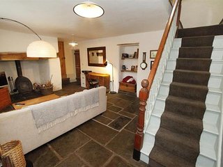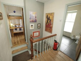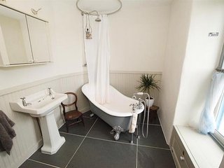 The stairs lead up from the lounge to a hallway that has three bedrooms and a family bathroom complete with rolled top bath.