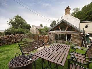 The eating area leads into a patio that has steps up into a garden with chairs/tables and sea views.